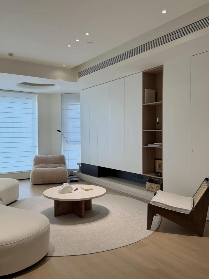 客厅以圆形家具和大窗户引入自然光线