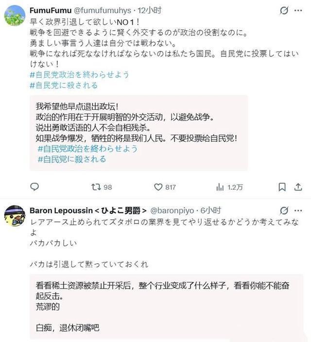 这几乎就是赤裸裸的战争叫嚣。不用中方回应,日本民众就先“炸锅”了。在麻生这番荒谬言论发表后,相关视频评论区里,几乎清一色是怒骂——“蠢货”“白痴”“老不死的”“闭嘴吧你”……类似的词语层出不穷。