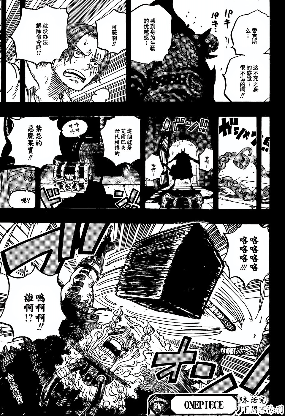 哈拉尔德国王还是城堡里展开激战,红发香克斯和贾巴,巨人族战士等人对战哈拉尔德国王。洛基王子获得了两样东西,他就可以对抗哈拉尔德国王,他终于赶过来了。