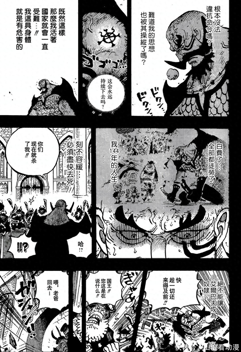 城堡里只剩下几人活着,士兵基本上被杀死了,洛基王子马上使用能力对付哈拉尔德国王,还使用铁雷攻击,红发香克斯和贾巴也发起攻击,他们联手斩杀了哈拉尔德国王。洛基王子背黑锅了,他被塑造成为一个杀死国王的诅咒王子。